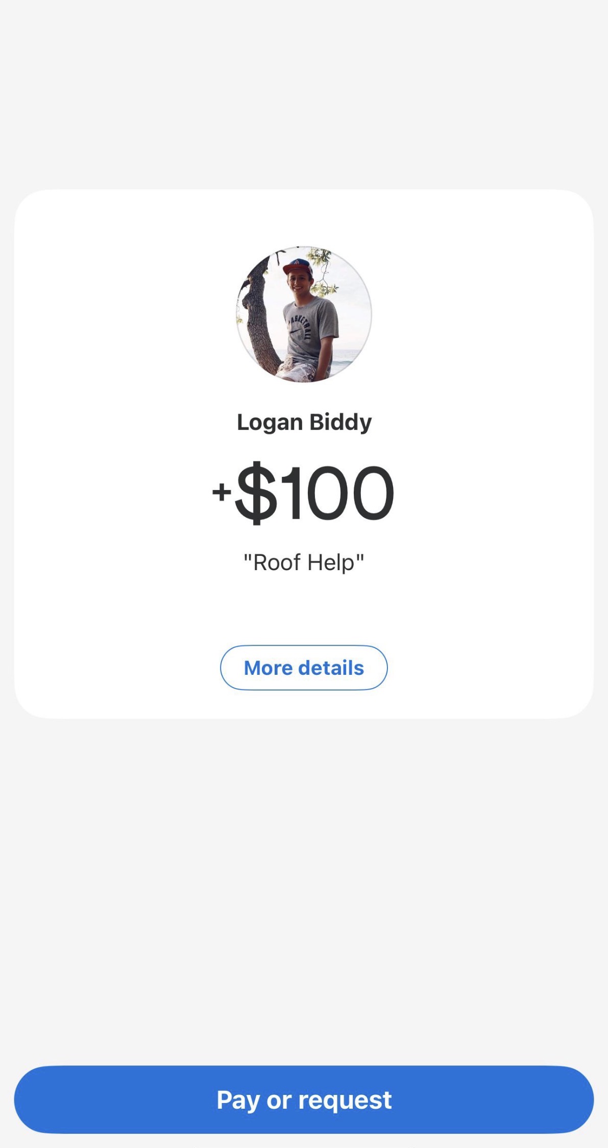 - Venmo screenshot labeled 'Roof Help' — see image.